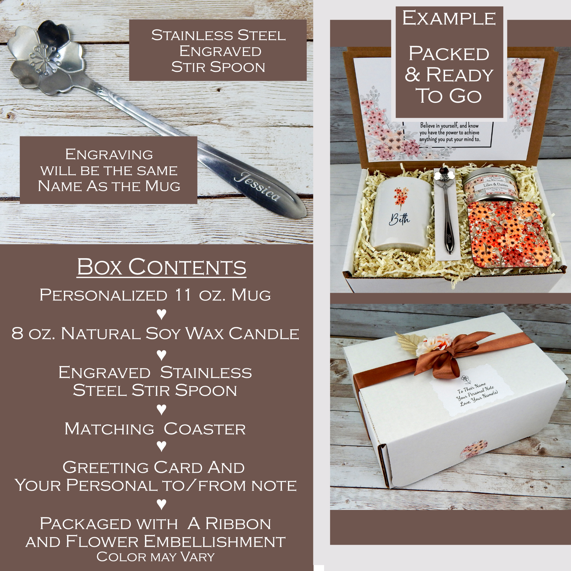 Celebrate the special bond with your daughter through our heartwarming gift basket, featuring a personalized mug, matching coaster, engraved spoon, and a scented candle. Whether it's her birthday, graduation, or simply a thoughtful gesture "just because," this delightful gift is sure to bring a smile to her face and warm her heart.